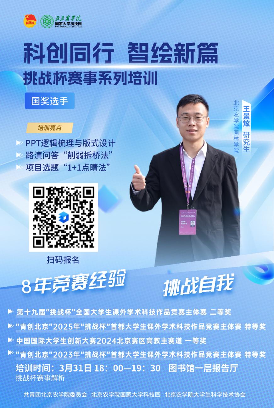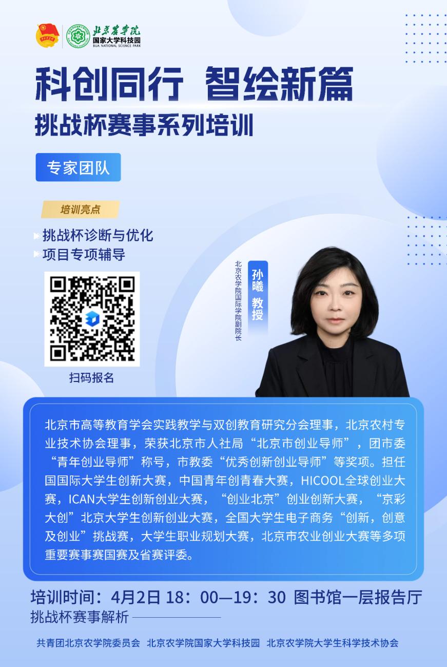 为深入学习贯彻习近平新时代中国特色社会主义思想,引导和激励大学生通过广泛的社会实践、深入的社会观察,增强对国情社情民情的了解,培养自身科学精神和科学态度,激发创新创业精神,发挥以赛促教、以赛促学、以赛促创的精神,为中国式现代化贡献青春力量,校团委联合国家大学科技园举办2026年“挑战杯”暨“农林杯”赛事系列培训,现将相关事项通知如下: