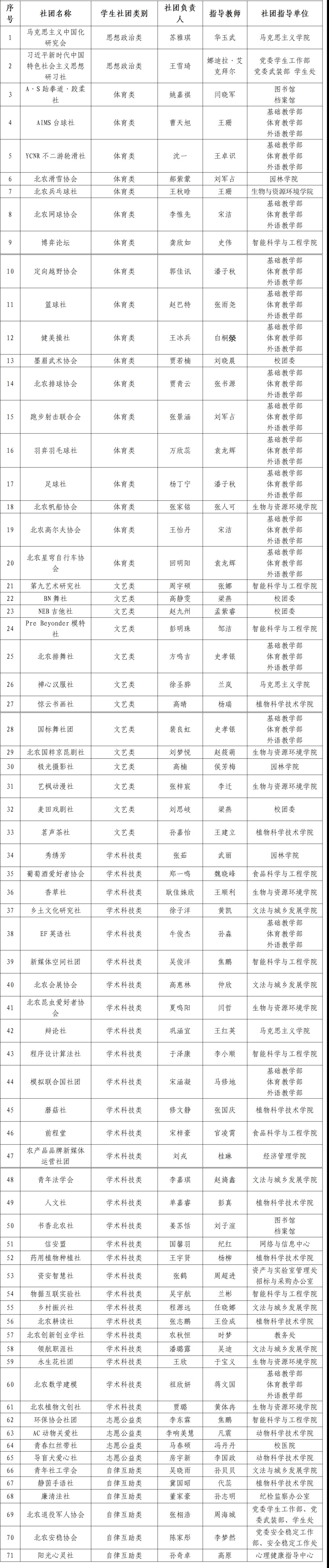为进一步加强我校学生社团建设管理,促进学生社团健康有序发展,根据《北京农学院学生社团建设管理办法》(北农党发{2021}17号),在全校范围内开展2025-2026学年第一学期学生社团注册。经学生申报,指导教师同意及业务指导单位审核等程序,本学年完成注册登记学生社团予以公示,具体如下: