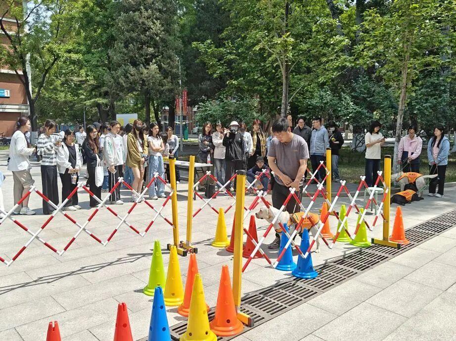 活动一:“爱心启航”导盲犬知识讲堂。“爱心启航”导盲犬知识讲堂以普及导盲犬知识、消除公众认知误区为核心,通过多元形式展开活动。活动现场,专业训导员带领导盲犬演示“绕障通行”“上下楼梯”等工作技能,同步讲解导盲犬相关知识,以其工作中“零互动”的绝对专业性,纠正公众将导盲犬等同于普通宠物的错误认知。随后,向大家系统性普及导盲犬知识,填补认知空白,帮助大家了解导盲犬的工作压力与行为限制。此外,本次活动还设置了“假如给我三天黑暗”和“盲感探秘”模拟体验环节,让参与者切实感受视觉缺失后的空间迷失与依赖他人的不安,帮助大家激发传播导盲犬正确知识的责任感。