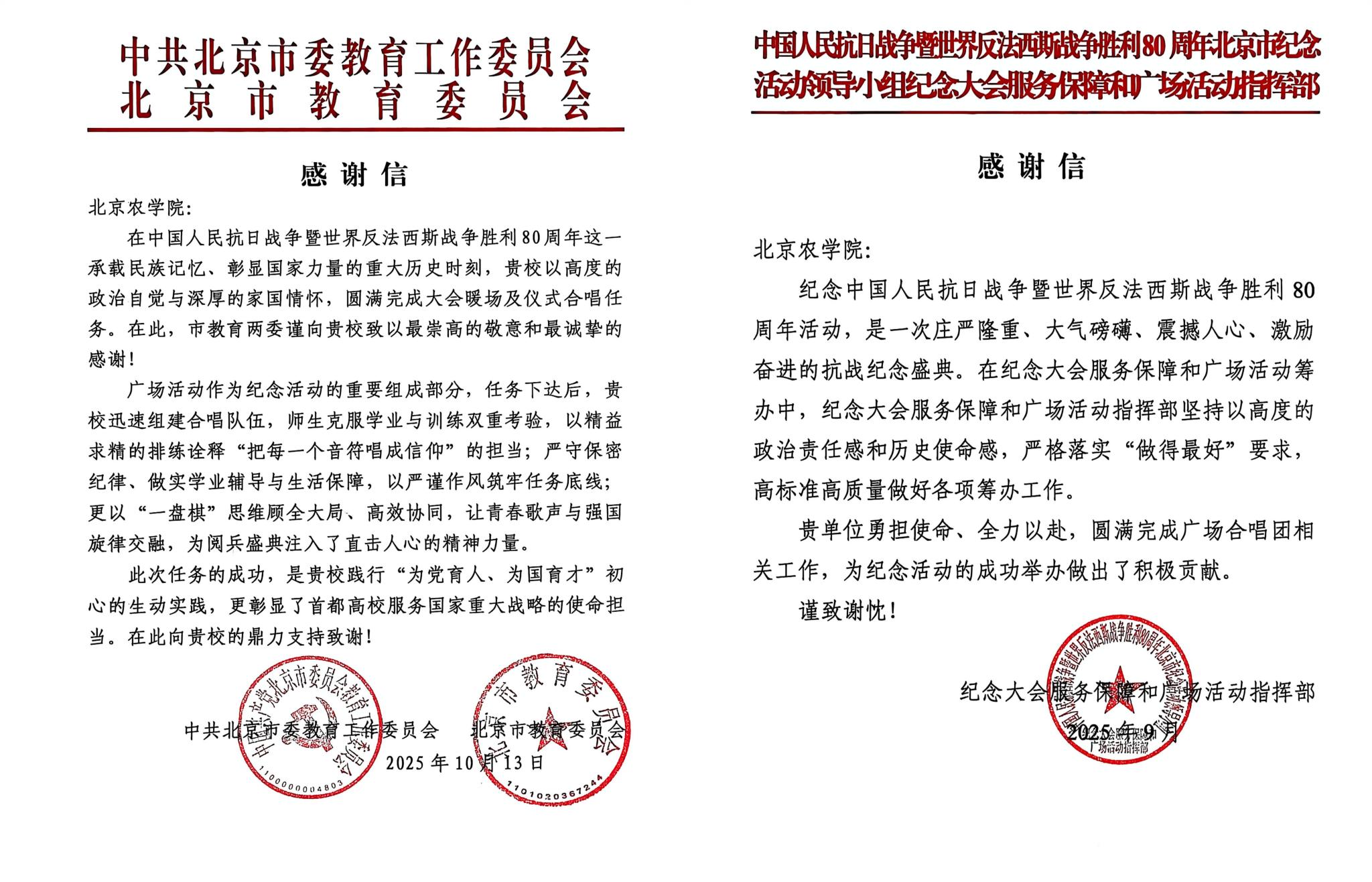 近日,北京农学院收到来自中共北京市委教育工作委员会、北京市教育委员会与纪念大会服务保障和广场活动指挥部的两封感谢信,信中对学校在纪念大会广场活动中圆满完成合唱工作的贡献给予高度评价,称赞师生“彰显了首都高校服务国家重大战略的使命担当”。