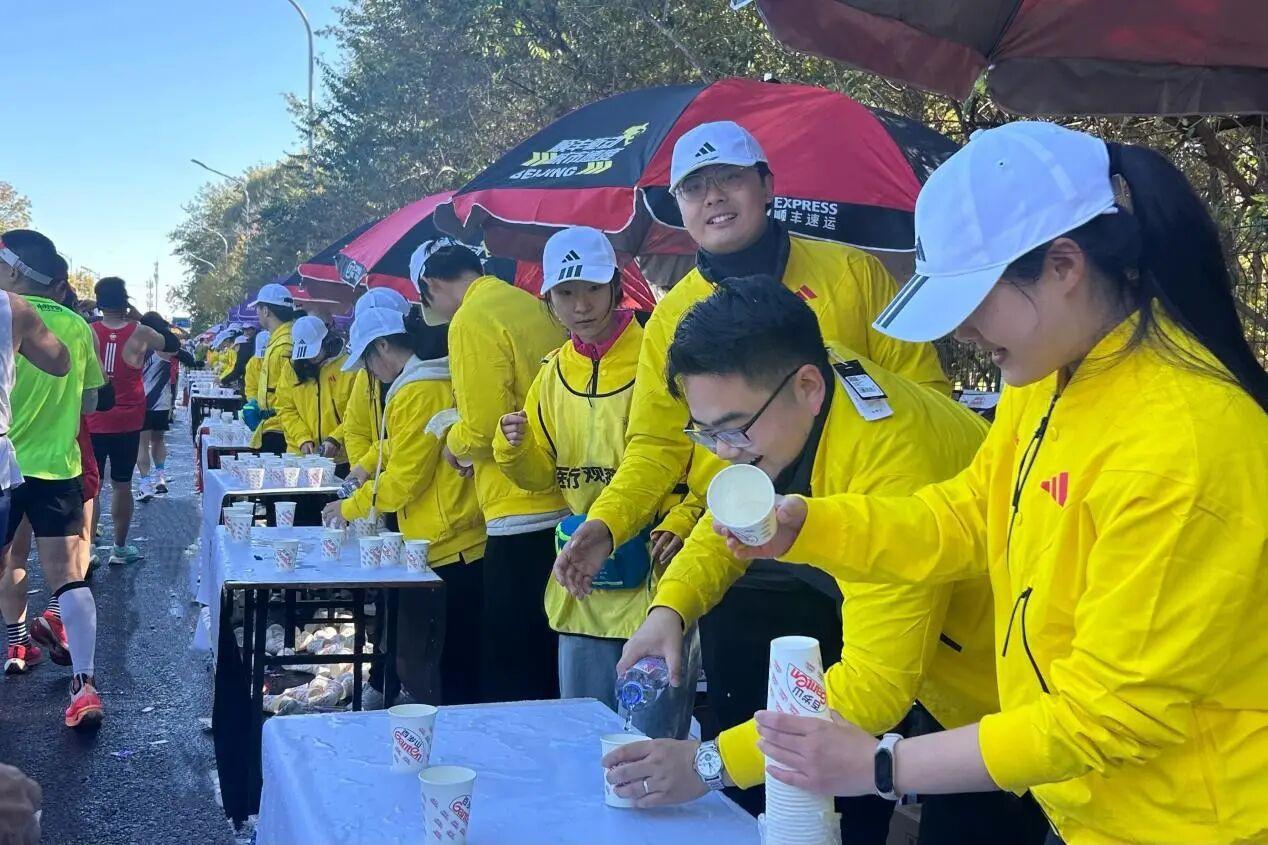 在37.5公里的补给桌后,我们迅速地续满水杯,确保每一位经过的跑者都能顺畅地取用。在人流最多的时间段,我们10号桌子上的志愿者靠着专注的眼神和无声的默契让桌子上的水没有断过。看着他们取水、饮下、继续奔跑的动作,我深切感受到了满足感、获得感与幸福感。我们成为了赛道上最可靠的后盾,用行动致敬着每一份坚持。