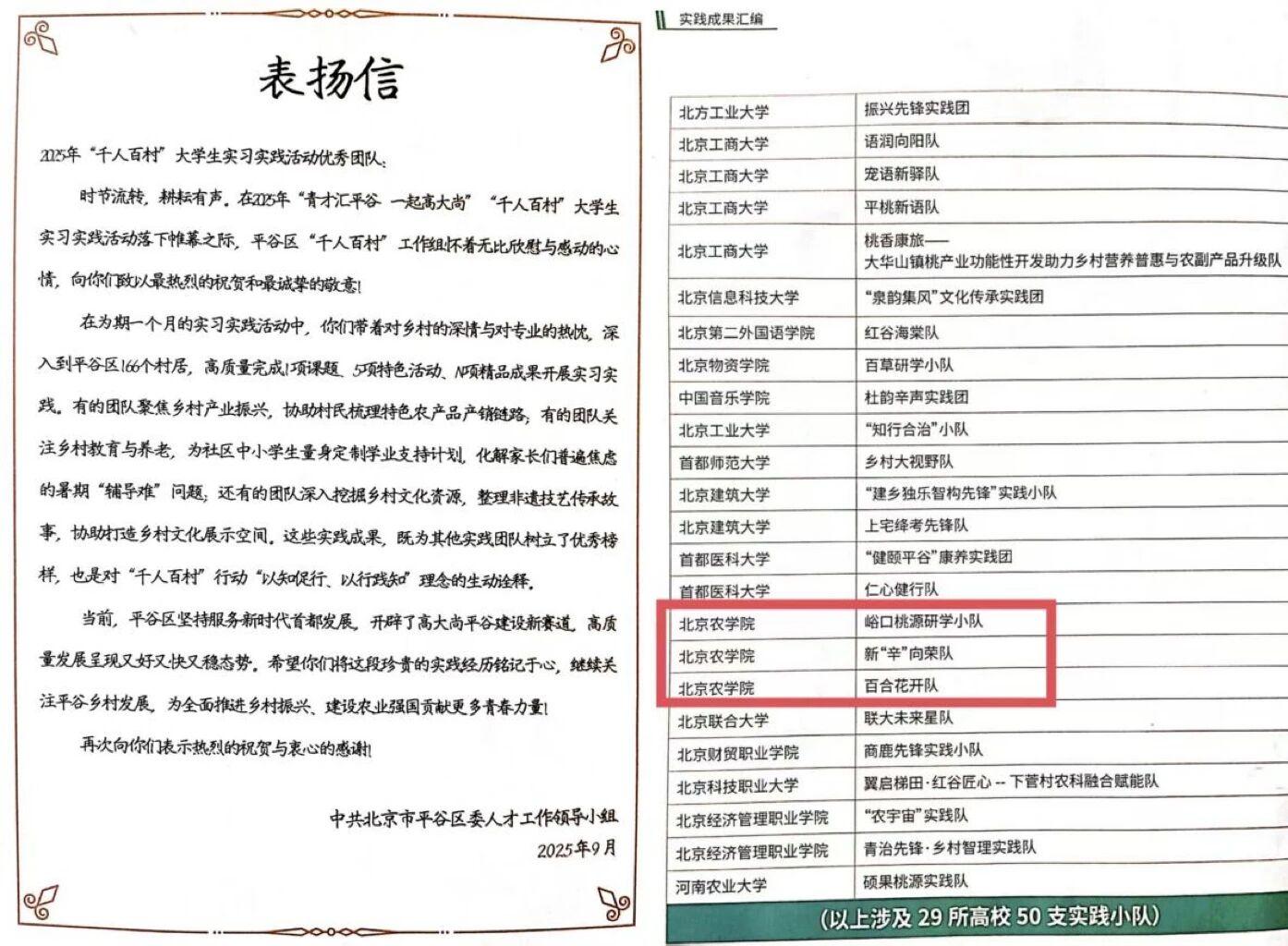近日,2025年平谷区 “青才汇平谷 一起高大尚” “千人百村”大学生实习实践活动优秀团队名单正式公布,我校3支团队凭借突出的实践成果、鲜明的特色亮点,斩获优秀团队称号。
