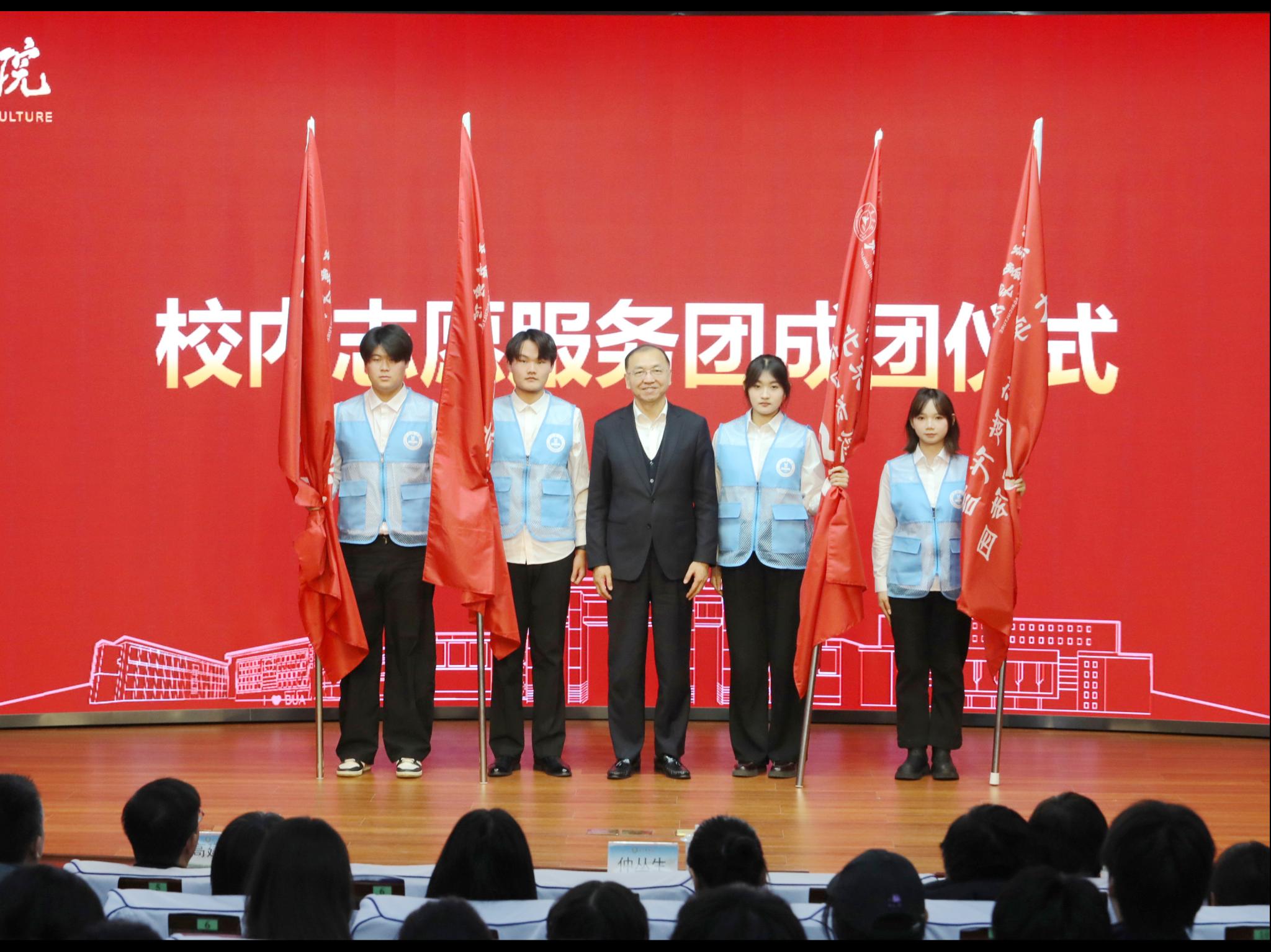 会议宣布成立了“我为母校做代言”大学生招生宣传团、“北农耕读”实践团、北京农学院勤禾志愿团、北京农学院平安校园志愿者行动队4支校内志愿服务团,仲丛生为志愿服务团授旗。