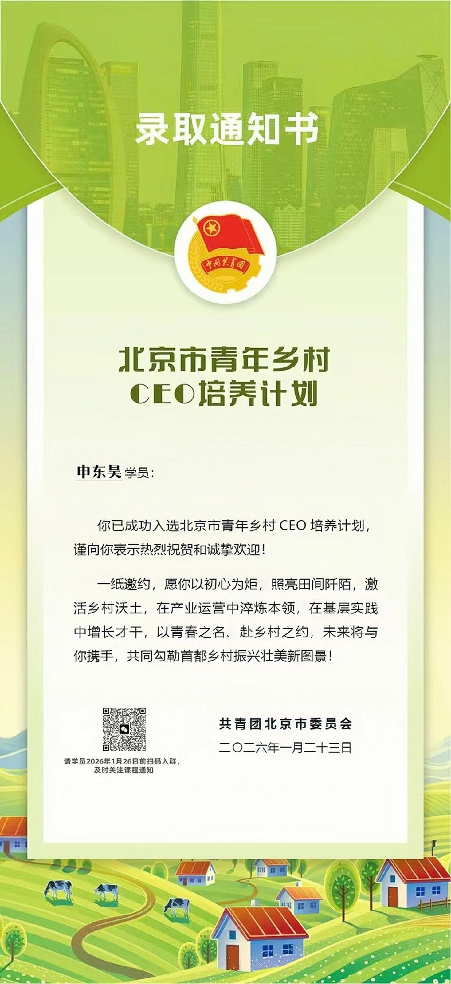 热烈祝贺我校郭涛、申东昊两位同学成功入选“北京市青年乡村CEO培养计划”!该计划由团市委组织实施,旨在培育一支懂农村、通产业、善经营的青年乡村运营人才队伍,助力首都乡村旅游高质量发展。经个人申请、学院初选、学校推荐和团市委严格审核,两位同学从众多竞争者中脱颖而出,成为全市高校组20名入选者中的优秀代表。