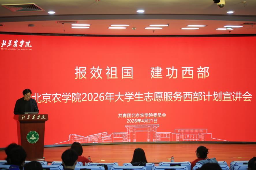 为深入学习贯彻习近平总书记给新疆谢依特小学戍边支教西部计划志愿者服务队队员的回信精神,引导毕业生投身西部建设,4月21日,北京农学院2026年“报效祖国,建功西部”大学生志愿服务西部计划宣讲会在图书馆报告厅顺利举办。北京市西部计划项目办宣讲团成员、校团委相关负责同志、毕业年级辅导员及百余名青年学子到场参与。