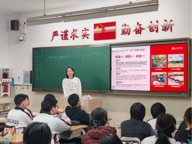 宣讲过程中,队员们站在熟悉的高中讲台,从北农70年的深厚办学历史讲起,详细介绍学校优势特色学科、人才培养体系与丰富多彩的校园生活,结合自身在北农的成长故事,耐心解答同学们关于专业选择、升学就业、校园文化等各方面的疑问,帮助高三学子更清晰地认识北农的办学特色与培养优势,也在他们心中埋下了报考北农的种子。